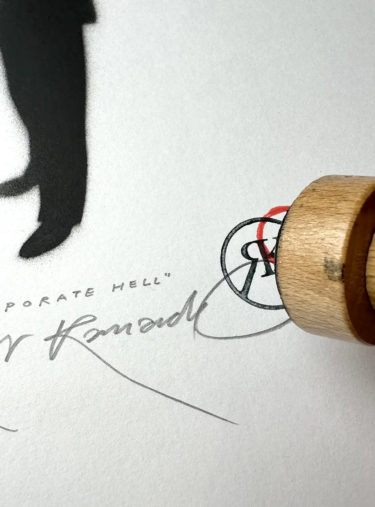 - “Corporate Hell.” Spray paint on 360 g paper, 30 × 40cm, edition 1/20. Signed and stamped.