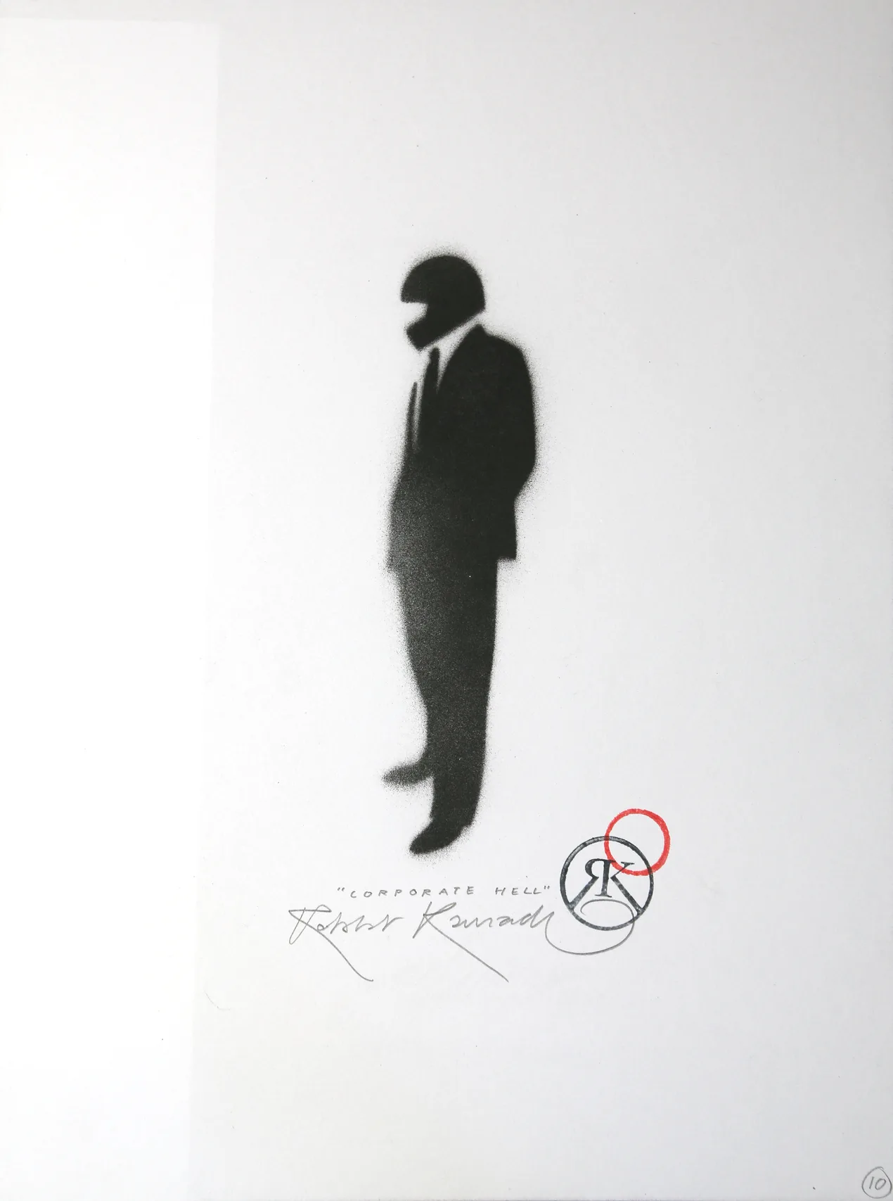 - “Corporate Hell.” Spray paint on 360 g paper, 30 × 40cm, edition 1/20. Signed and stamped.