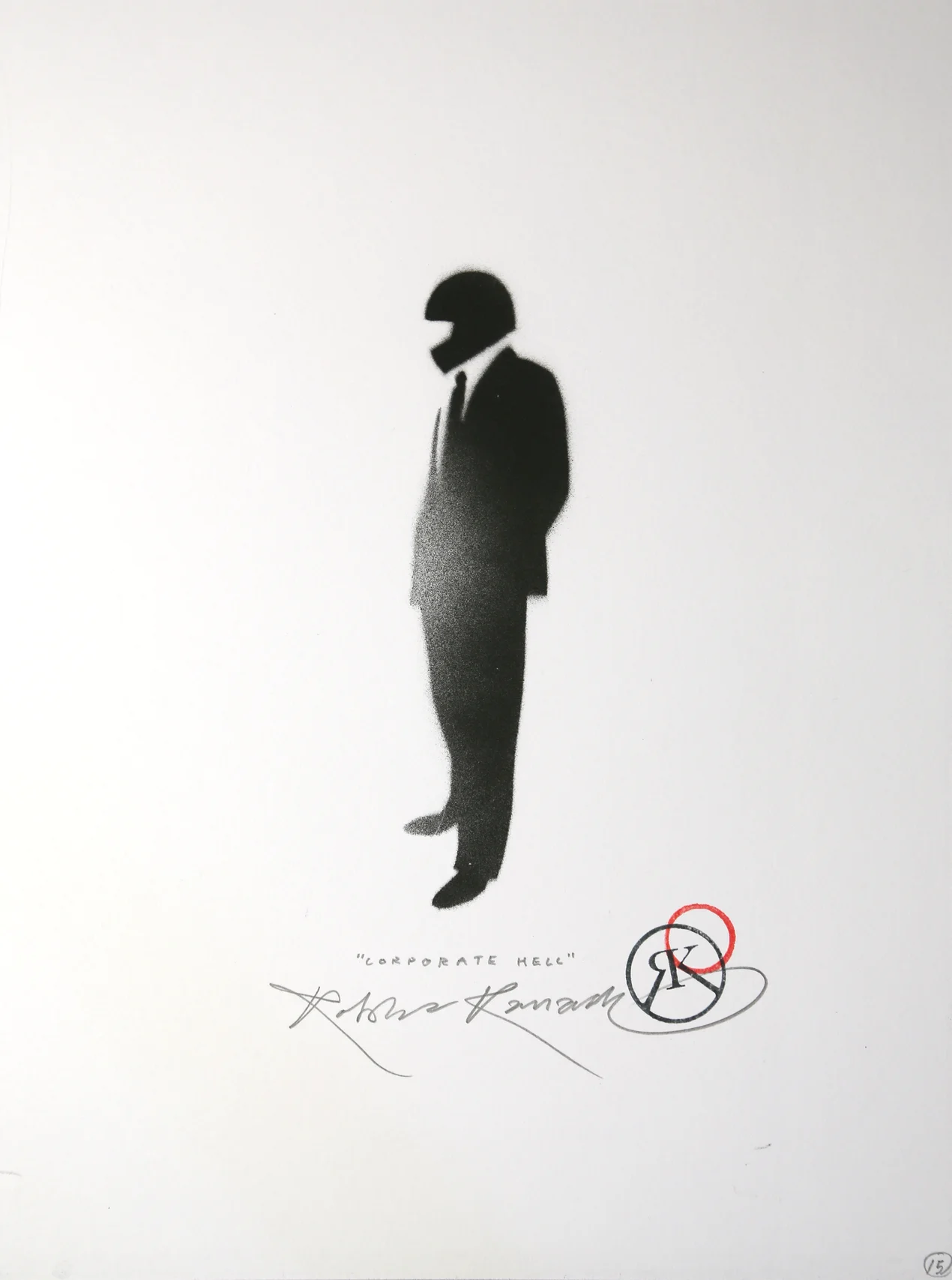 - “Corporate Hell.” Spray paint on 360 g paper, 30 × 40cm, edition 1/20. Signed and stamped.