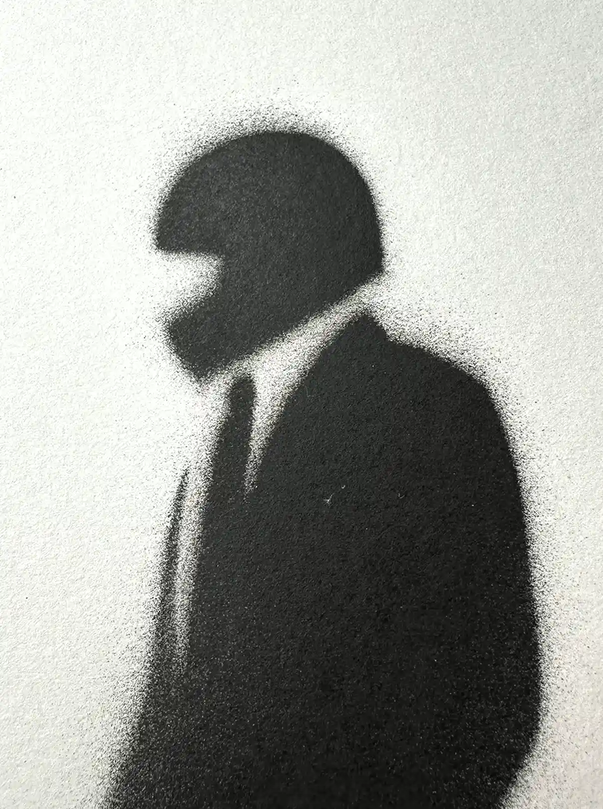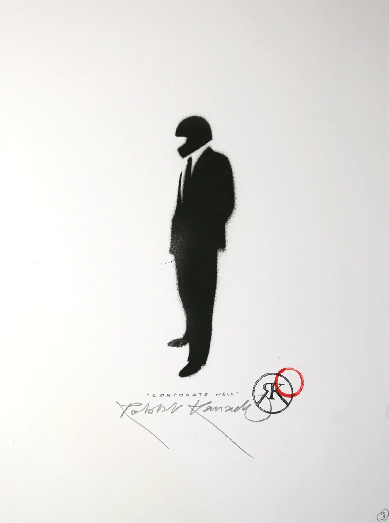 - “Corporate Hell.” Spray paint on 360 g paper, 30 × 40cm, edition 1/20. Signed and stamped.