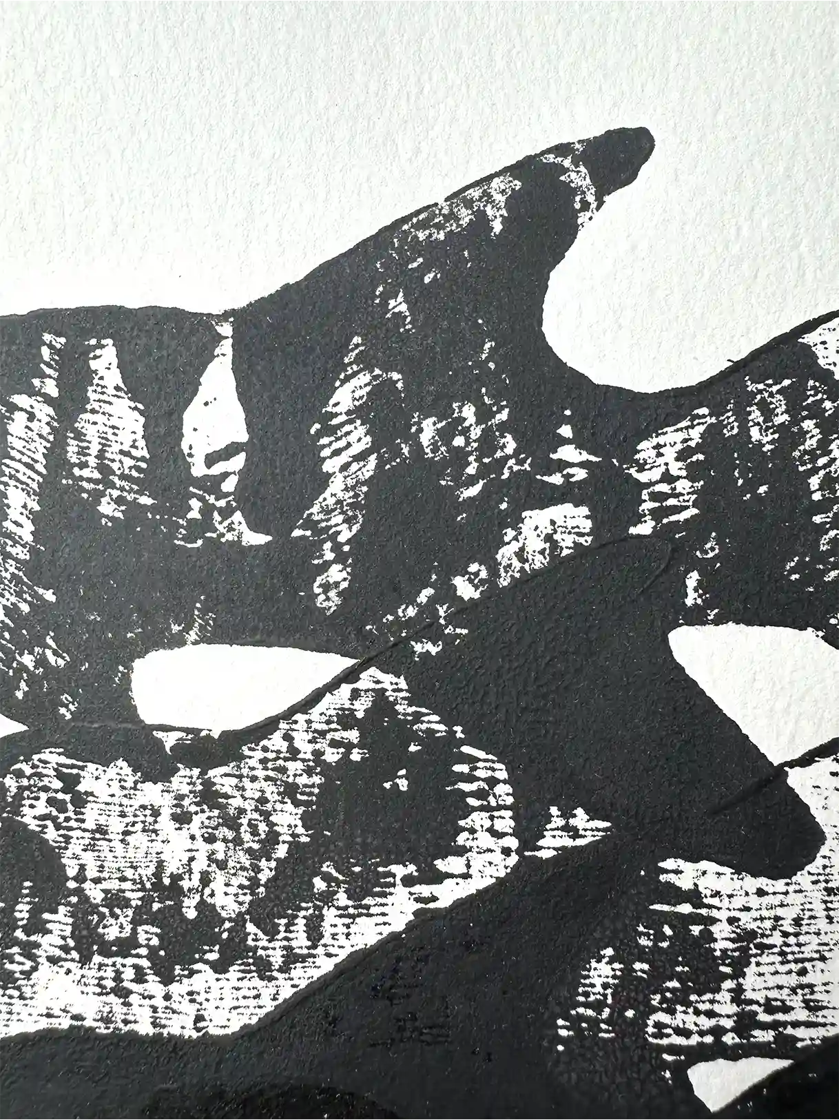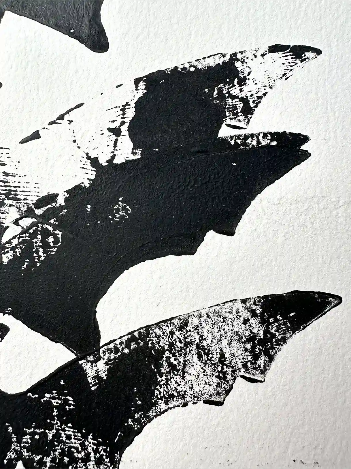 These monoprints are hand-printed on 360-gram paper, measuring 45 x 65 cm.