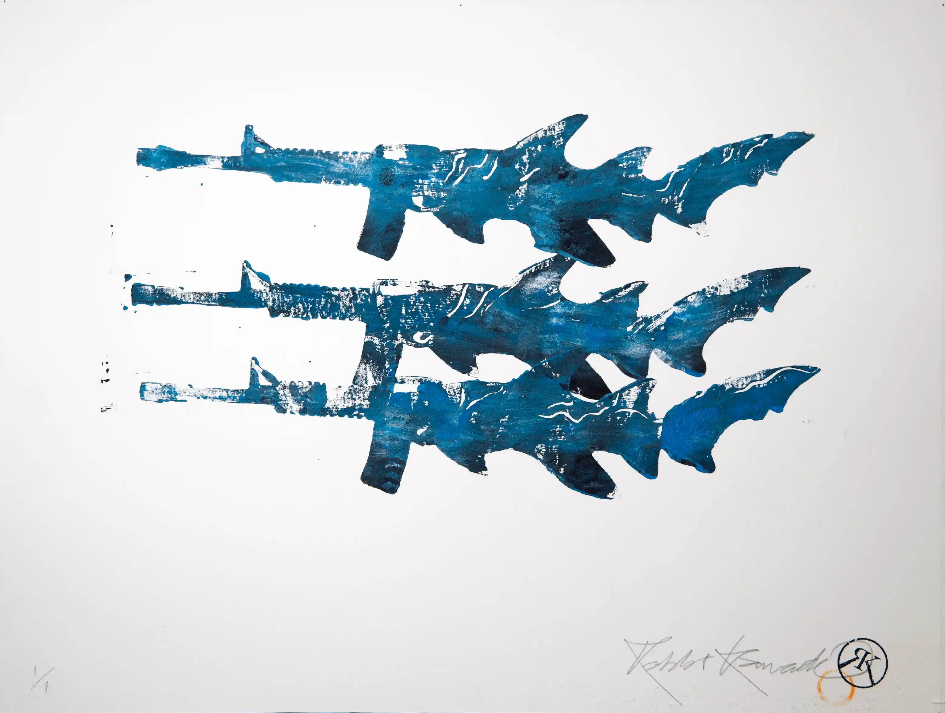 Excited by the idea, I decided to take the concept further; creating a linocut and printing theseunique artworks using acrylic paint. Each piece is a monoprint - a one of a kind - with only 11 inexistence, making the Gunfish a truly rare breed.